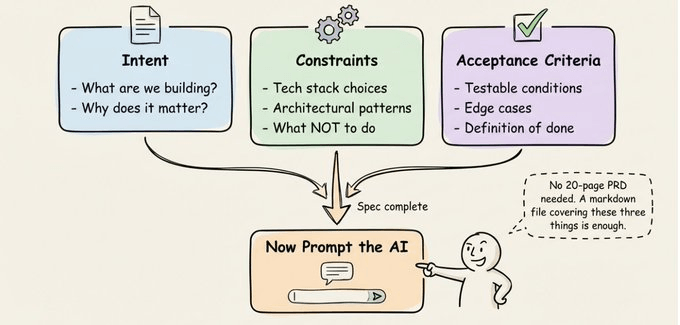 You don’t need a 20-page PRD. A markdown file covering these three things is enough.