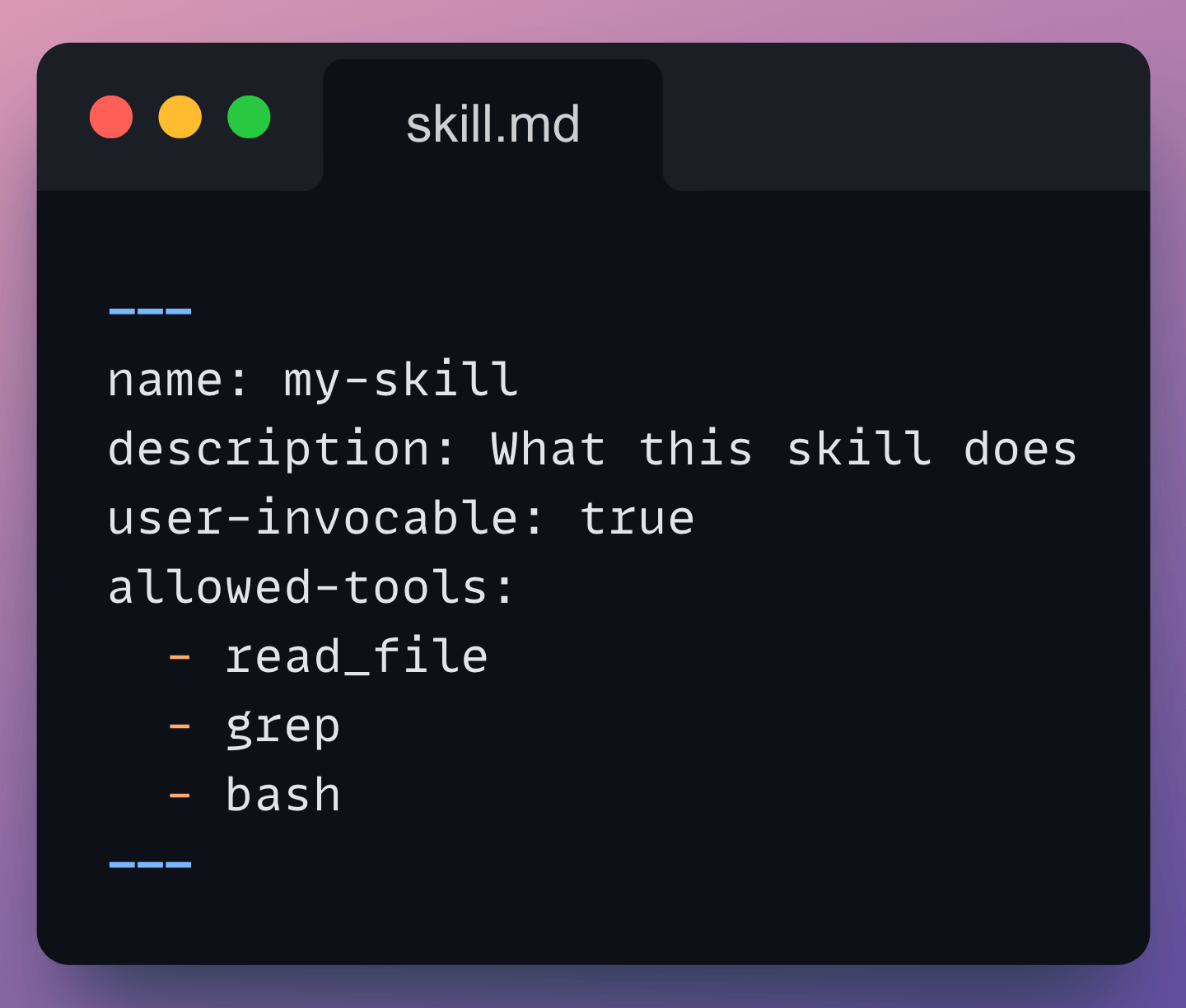 Skills are reusable components that extend what Vibe can do. They’re defined as markdown files with a YAML header specifying a name, description, allowed tools, and workflow instructions.