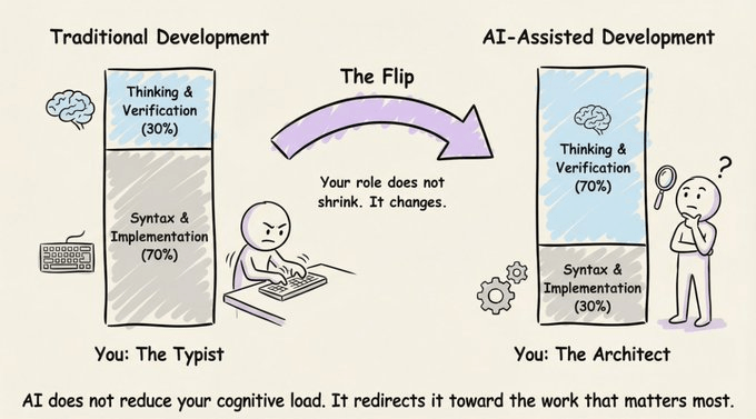 In traditional development, roughly 70% of your cognitive energy goes into translating ideas into syntax. In AI-assisted development, that flips. 70% goes into thinking clearly about what to build and verifying what the AI produced.