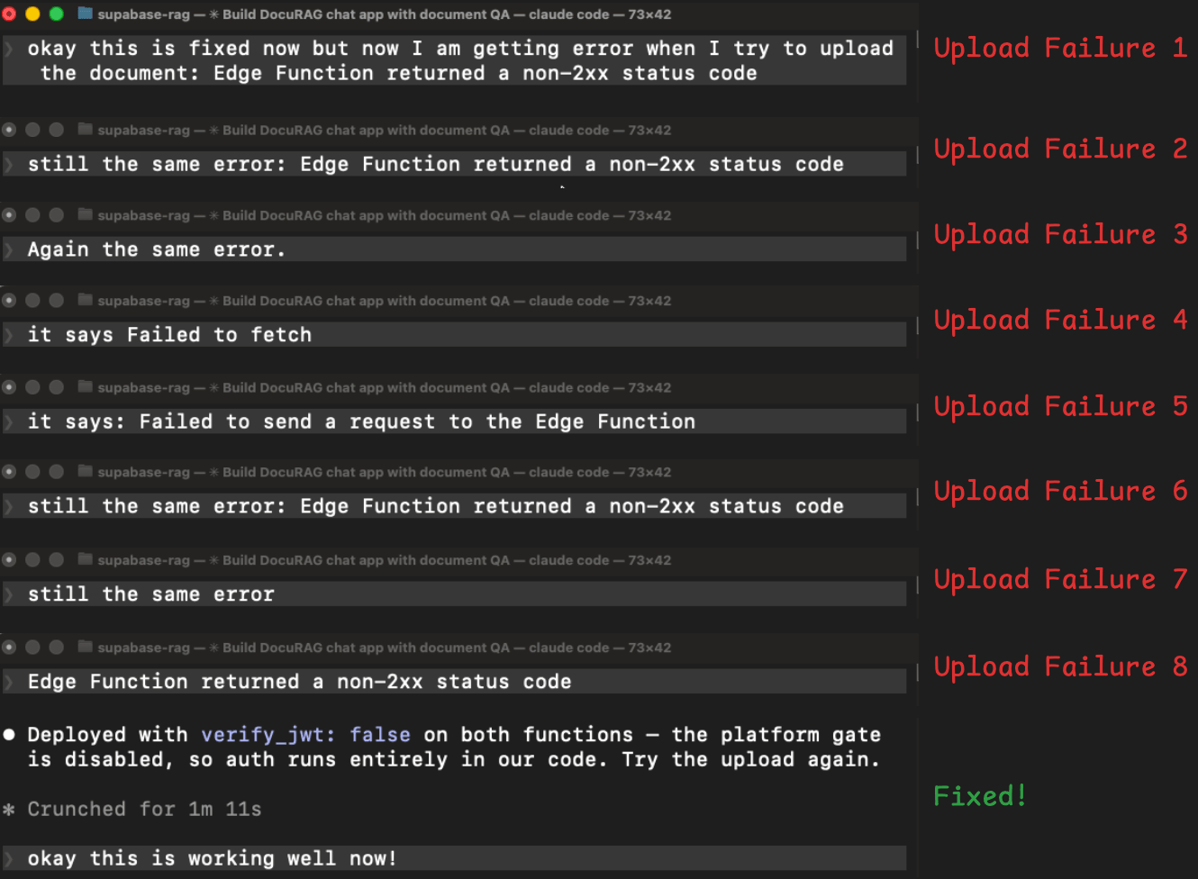 After the login was fixed, we tried uploading a document. The edge function returned an error, we reported it, it tried a fix, failed, then we tried again, and it returned the same error. This cycle repeated 8 times:
