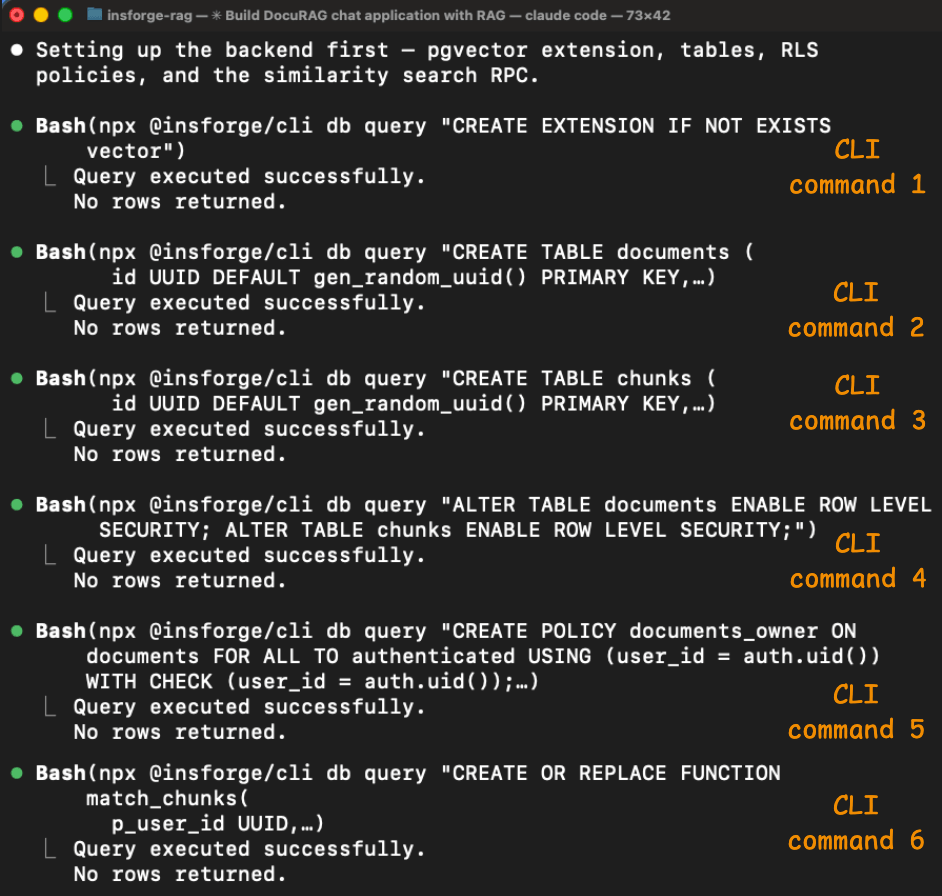 Each command returned structured output confirming what happened, so the agent could verify each step before moving to the next.
