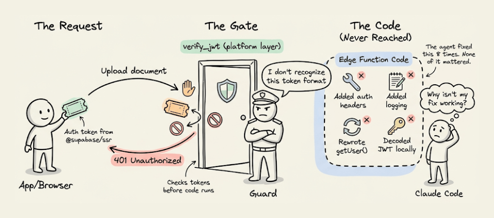 None of this was the agent’s fault. The Supabase platform’s verify_jwt gate was rejecting the token before the function code ran, and the logs didn’t distinguish between platform-level and code-level rejections.