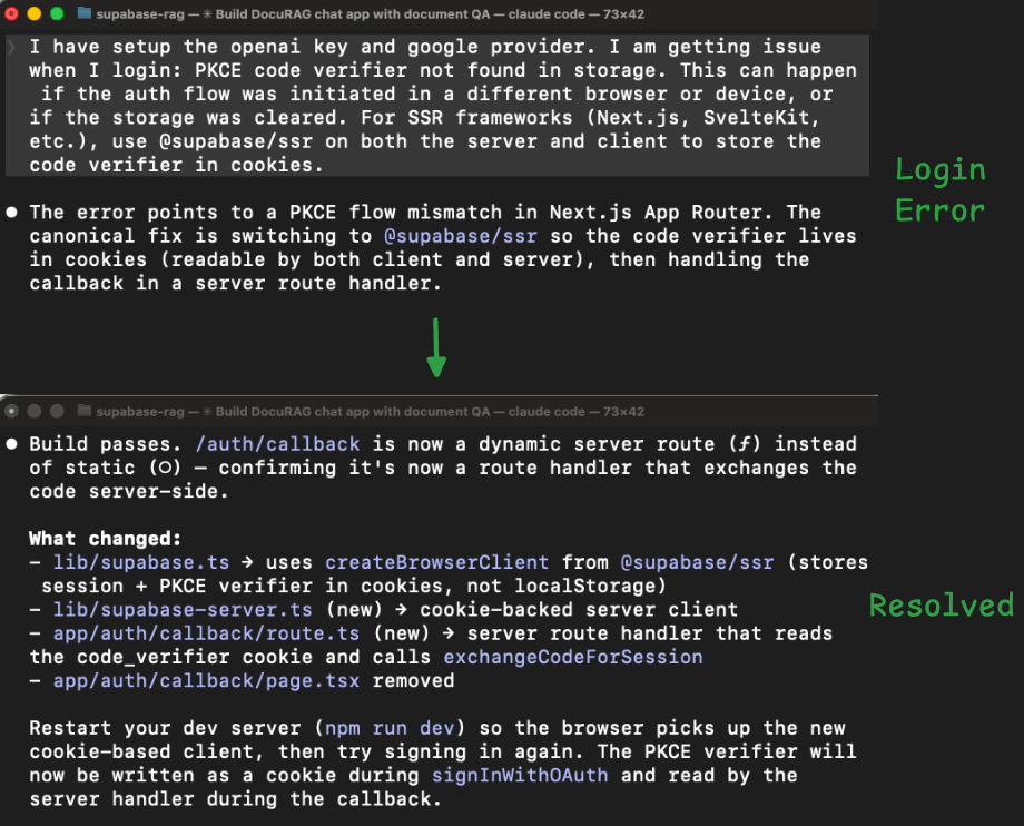 When we tried to sign in with Google OAuth, the app threw an error. The agent had wired the authentication using the wrong Supabase client library for Next.js.