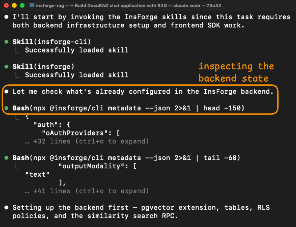 Its first action was npx @insforge/cli metadata --json, which returned a structured overview of the project, including the configured auth providers, existing tables, storage buckets, available AI models, and real-time channels.