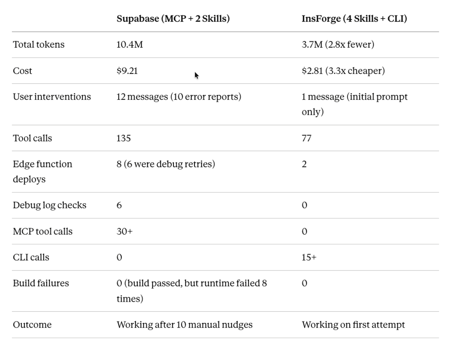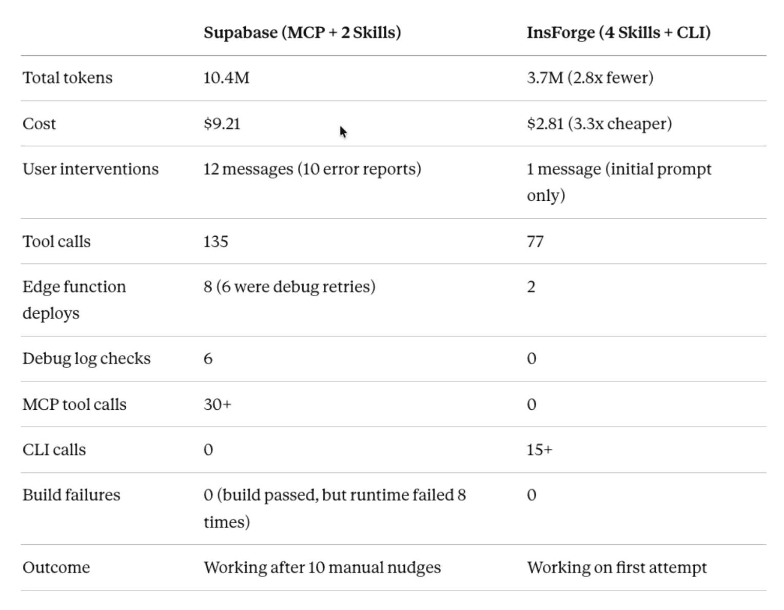 This inverts the typical usage pattern and is the main reason InsForge consumes far fewer tokens than Supabase on equivalent tasks.