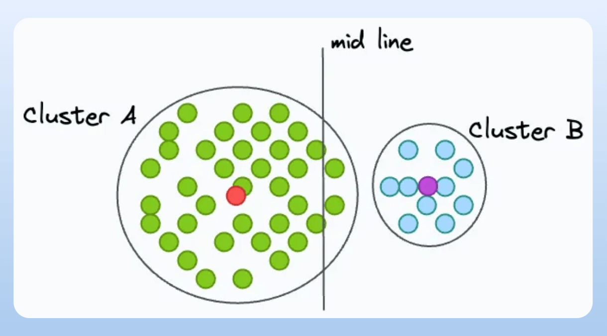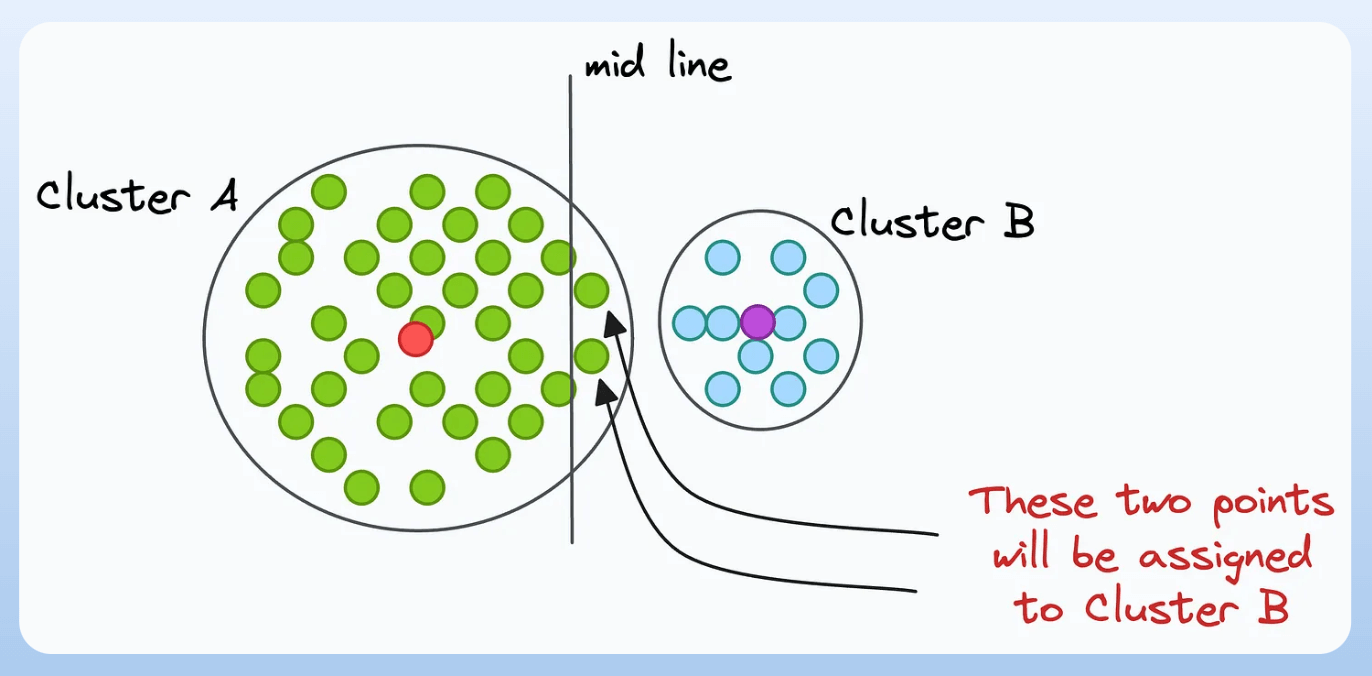 To understand this, consider two clusters in 2D—A and B, where Cluster A has a higher spread than B, and there’s a line mid-way between their centroids: