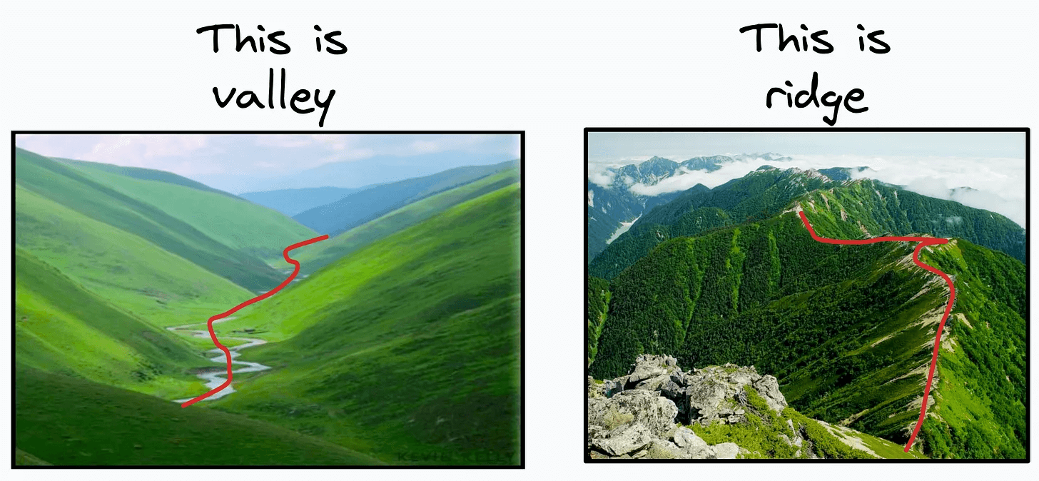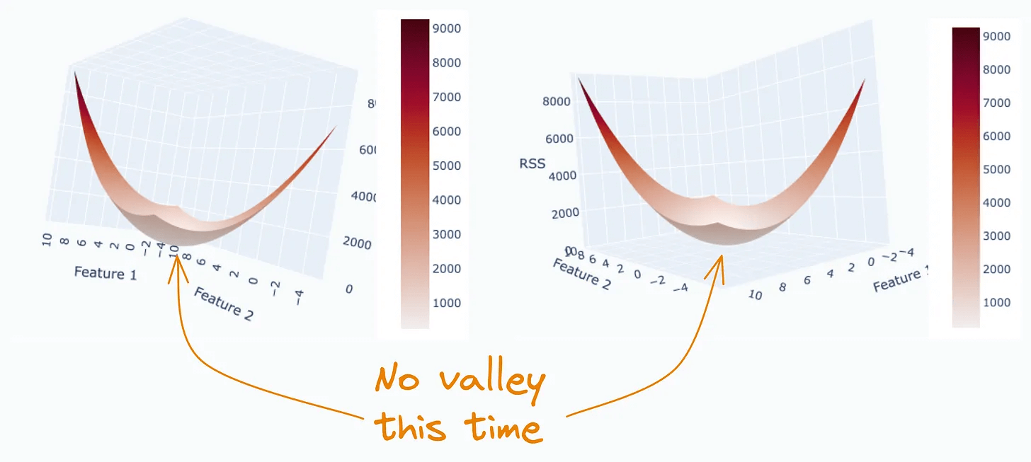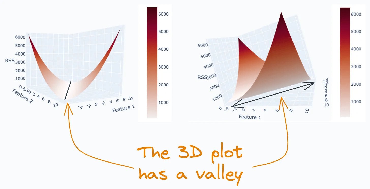The 3D plot above has a valley. This means there are multiple combinations of parameter values (θ₁, θ₂) for which RSS is minimum.