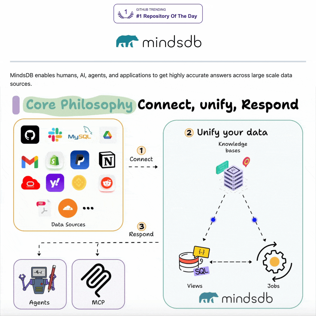 Connect your data: MindsDB connects to 200+ enterprise sources (Postgres, Salesforce, S3, Slack, etc.), so you can access everything, everywhere.