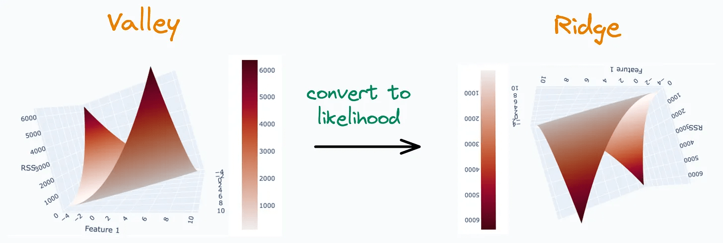 If we use likelihood instead (something which is maximized), it would invert the graph and result in a ridge:
