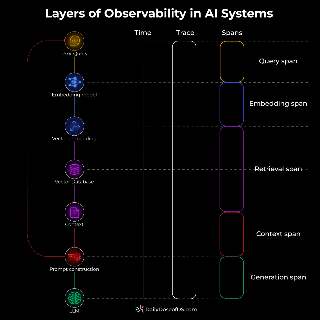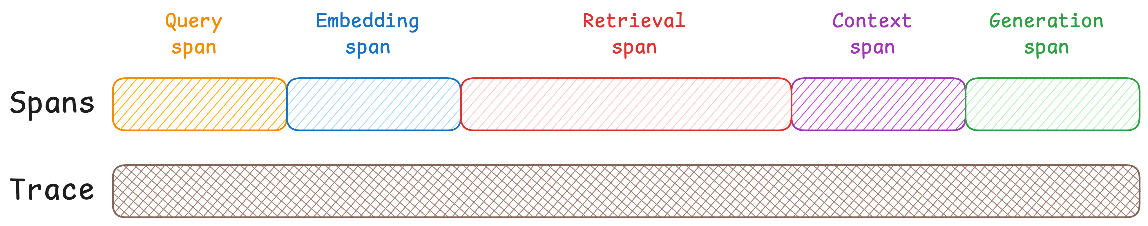 A Trace captures the entire journey, from the moment a user submits a query to when they get a response. Look at the "Trace" column in the diagram below. One continuous bar that encompasses everything.