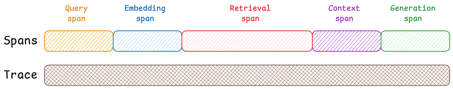 So if your system processes 1000 queries, you have 1000 traces. Each trace contains multiple spans (embedding, retrieval, generation, etc.), but they’re all linked by that one Trace ID.