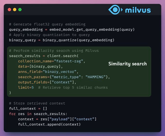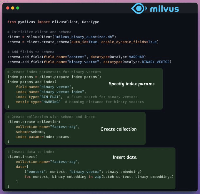 After our binary quantization is done, we store and index the vectors in a Milvus vector database for efficient retrieval.