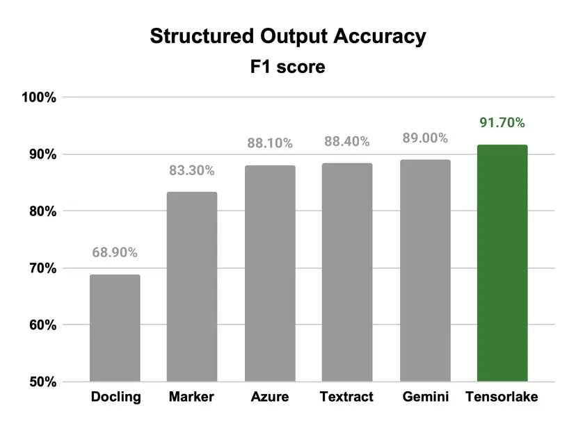 Tensorlake’s model hit 91.7 F1 on enterprise docs, outperforming Azure, AWS Textract, and open-source models like Docling and Marker, while matching Azure’s cost and beating Textract’s by 50%.