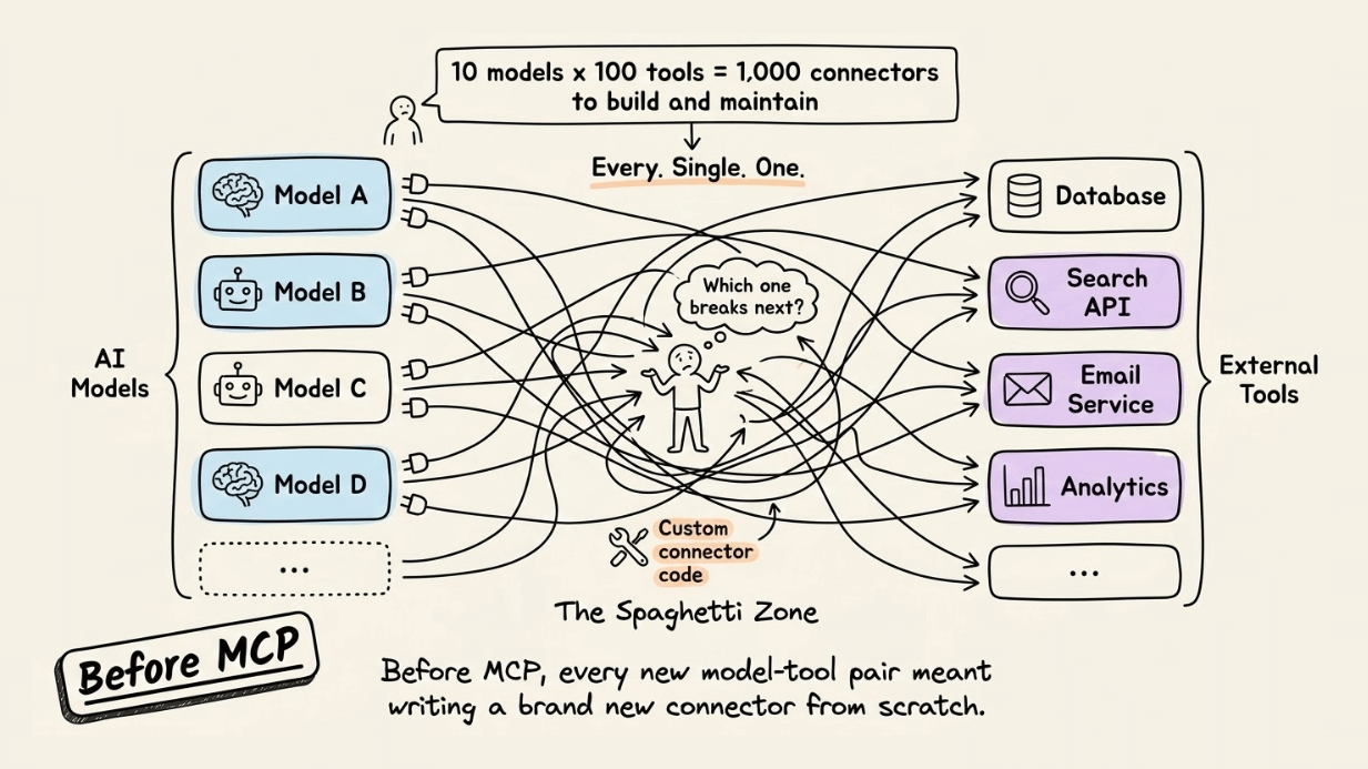Before MCP existed, connecting an AI model to an external tool meant writing custom integration code every single time.