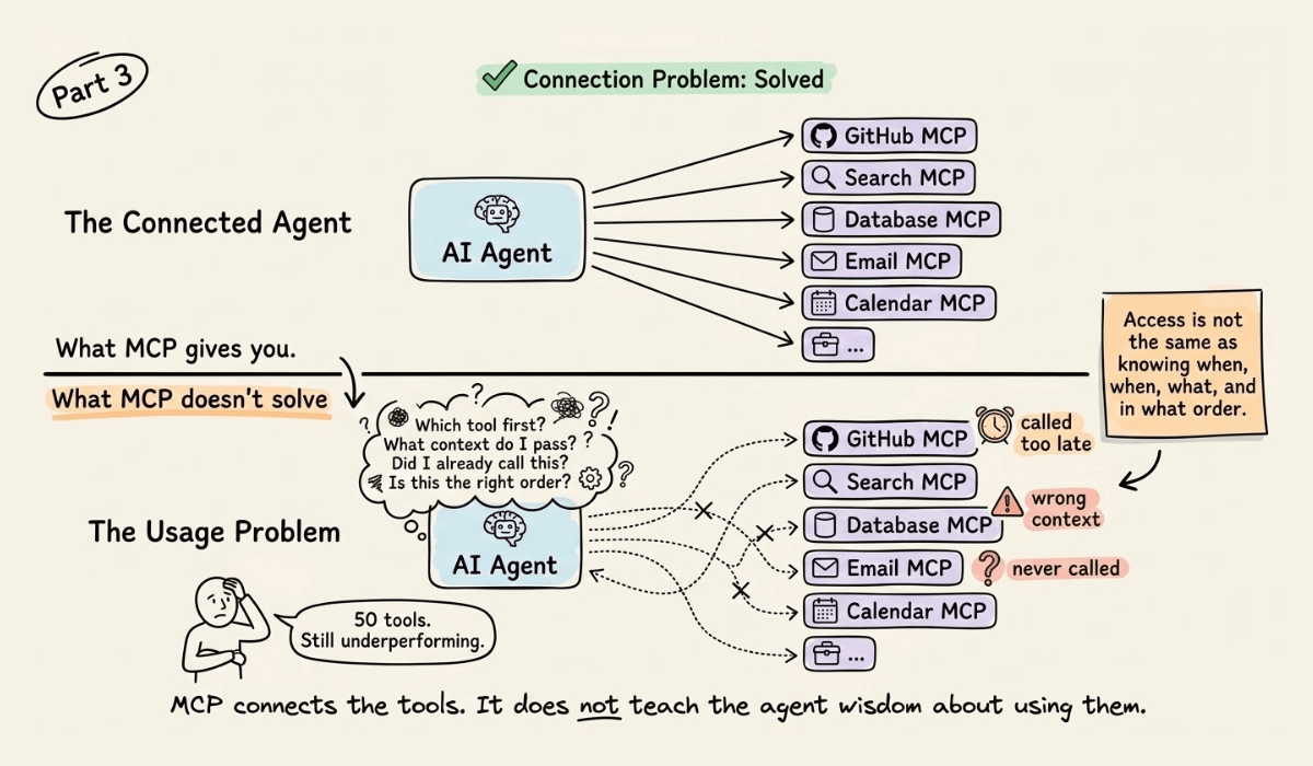 This means you can hand an agent 50 perfectly wired MCP tools, and it can still underperform if it doesn’t know when to call which tool, in what order, and with what context.