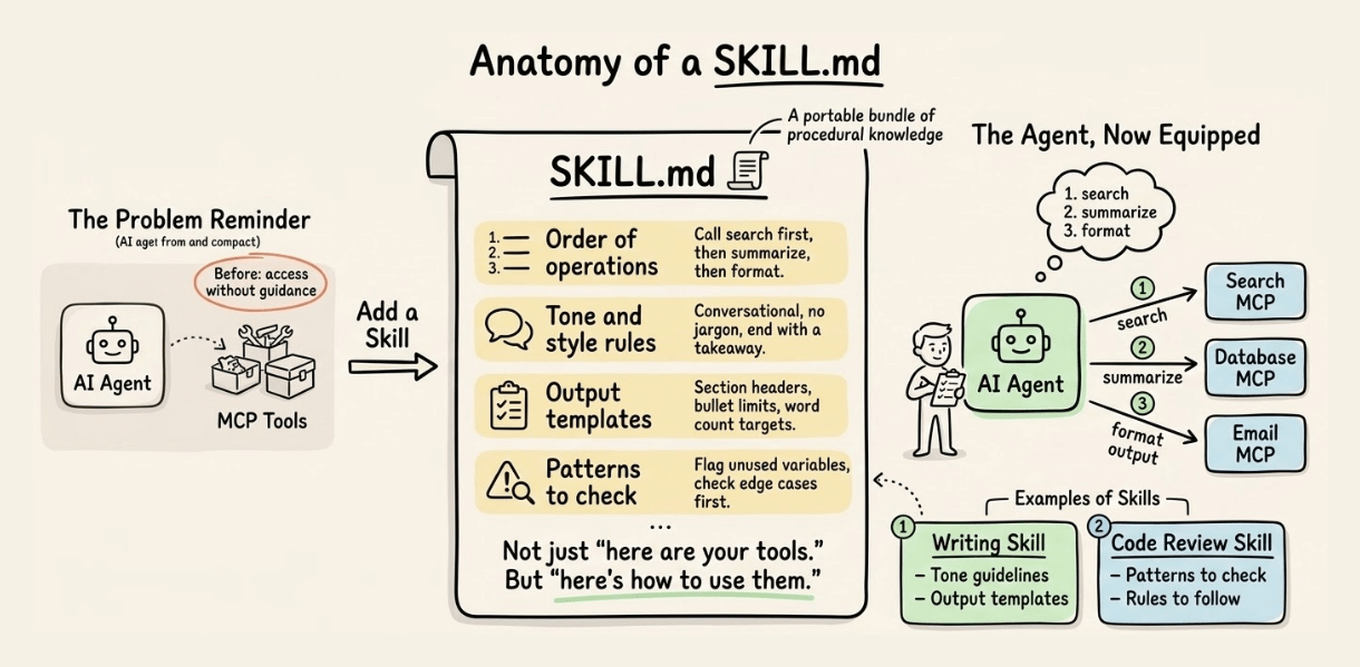 A Skill is a portable bundle of procedural knowledge. Think of a SKILL.md file that tells an agent not just “here are your tools” but “here’s how to use them for this specific task.” A writing skill bundles tone guidelines and output templates. A code review skill bundles patterns to check and rules to follow.
