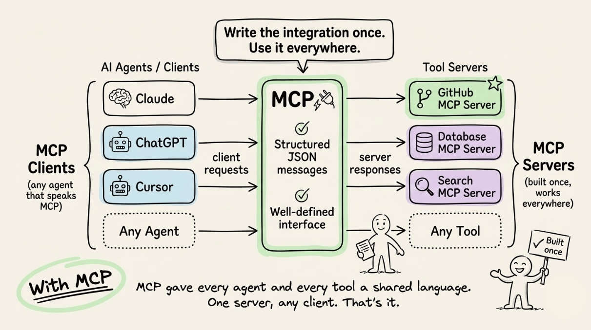 For instance, one could build a GitHub MCP server once, and it worked with Claude, ChatGPT, Cursor, or any other agent that spoke MCP. That’s the core value: write the integration once, use it everywhere.