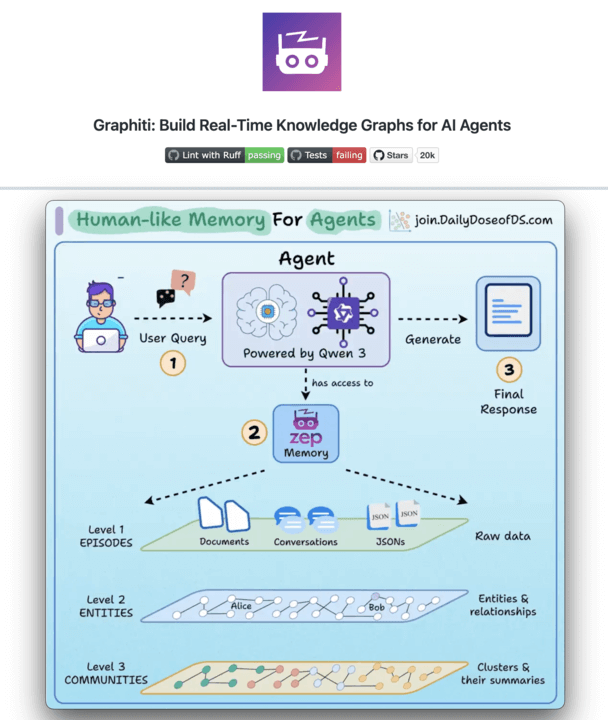 Graphiti MCP is an open-source temporal knowledge graph that provides AI agents with persistent relationship-aware memory (20k+ stars).