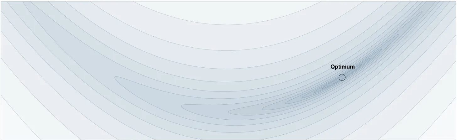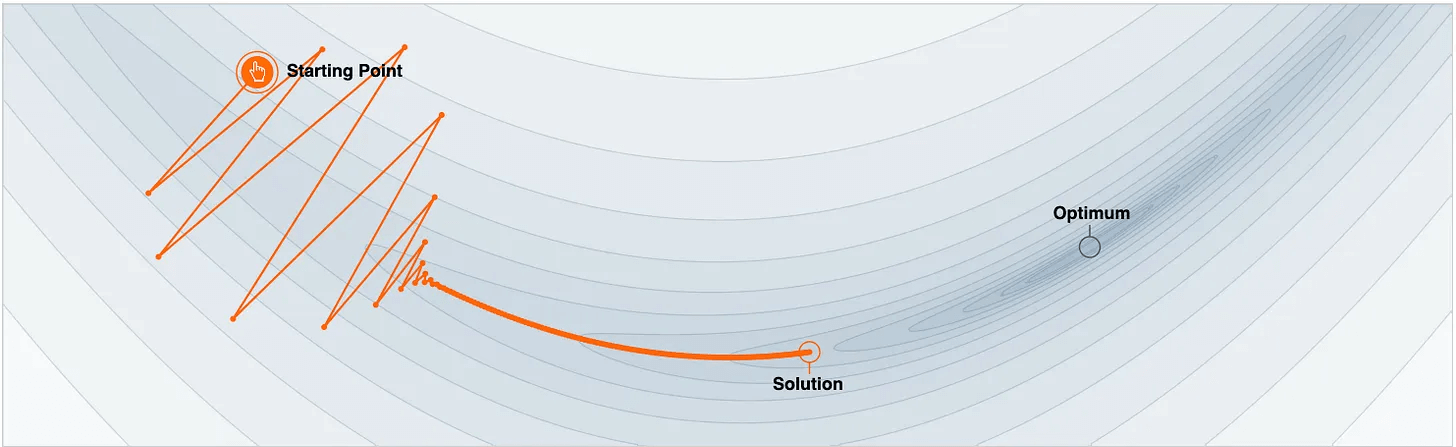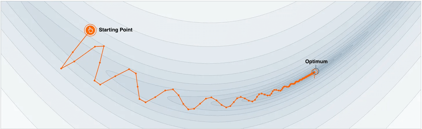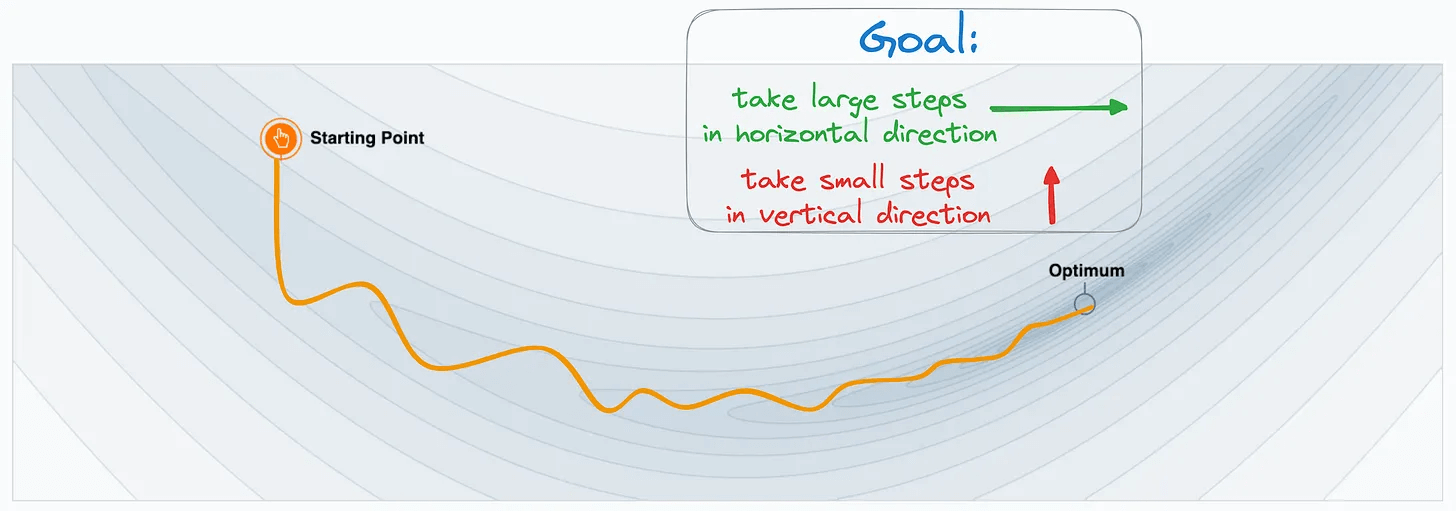 This smoothens the optimization trajectory and reduces unnecessary oscillations in parameter updates, as depicted below: