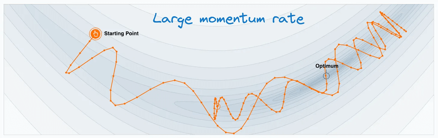 Setting a large Momentum rate will significantly expedite the gradient update in the horizontal direction, leading to overshooting the minima: