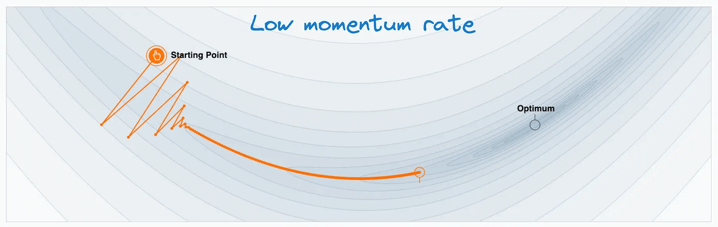 Setting a small Momentum rate will slow down the optimal gradient update, defeating the whole purpose of Momentum.
