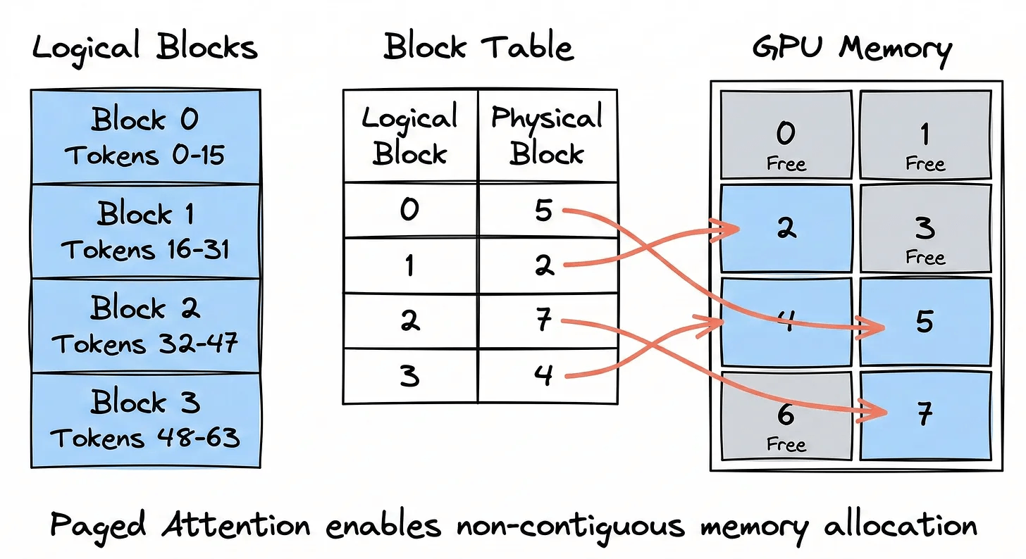 Block table (page table): Each request maintains a block table which is a simple mapping from logical block index to physical block location in GPU memory. When the model needs the KV cache for token 33, it looks up which physical block holds it, fetches it, and computes attention. The LLM doesn’t care where the block is physically sitting.