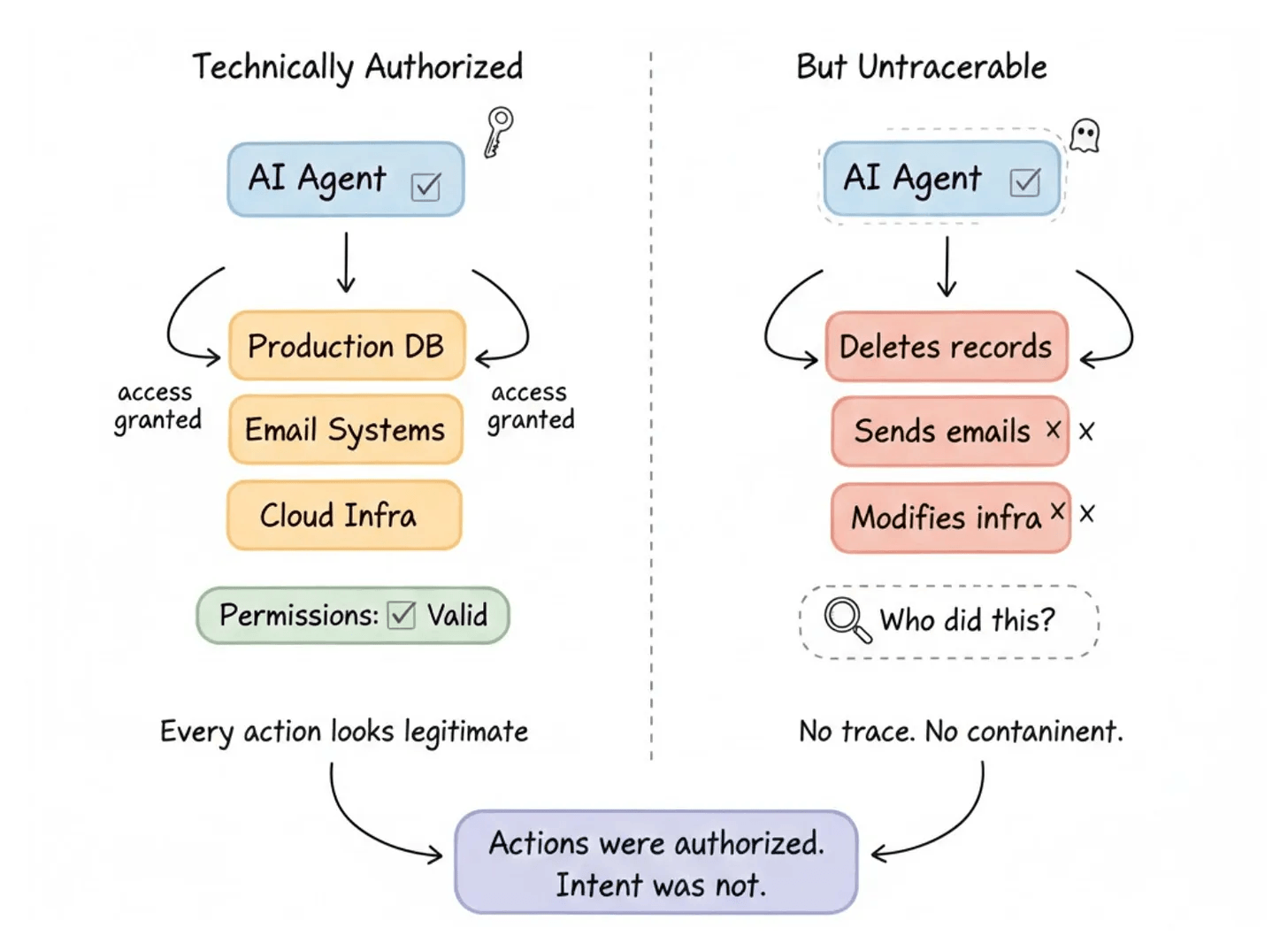 In every case, the agent had the permissions. The actions were technically authorized. But the intent behind them was not.
