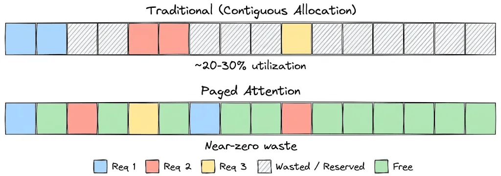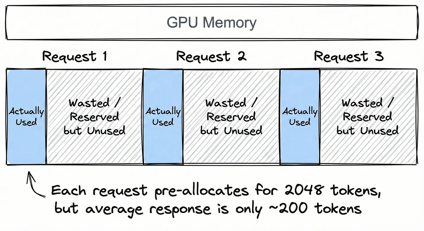 Imagine serving 100 concurrent users. You don’t know how long each response will be, so you pre-allocate space for the maximum possible length, say, 2048 tokens per request. But the average response turns out to be only 200 tokens.