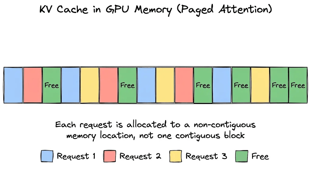 Block-level allocation: Instead of reserving one large contiguous block per request, the KV cache is divided into small, fixed-size blocks (typically 16 tokens each). These blocks can live anywhere in GPU memory and don’t necessarily need to be next to each other.