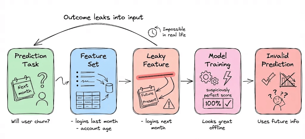 This is a common mistake in feature engineering. For instance, say you’re predicting whether a user will churn next month, and you accidentally include a feature like “number of logins in next month,” which obviously references the outcome.