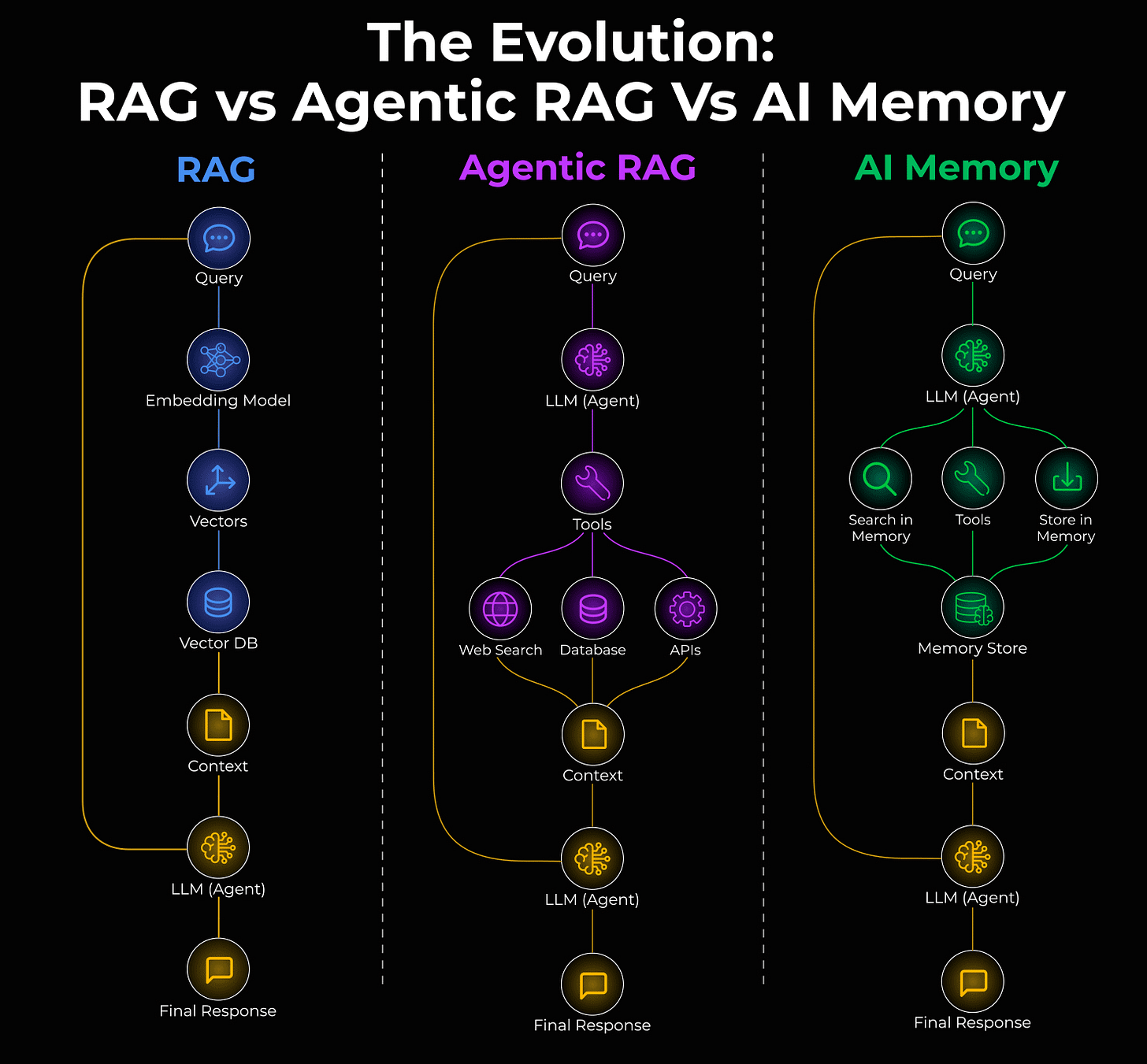 The visual breakdown of RAG vs Agentic RAG vs Memory is incredibly clear. I particularly appreciate the distinction between 'read-only via tool calls' and 'read-write via tool calls', that shift from static retrieval to active memory management is the real unlock for personalized agents. One challenge I've seen with long-term memory implementation is the 'memory pollution' problem you hinted at. Just as we need garbage collection in programming, agents need semantic garbage collection to prune outdated context, otherwise retreival precision degrades over time. It's interesting to see databases like Agentic Postgres tackling the forking branching aspect of this state management.
