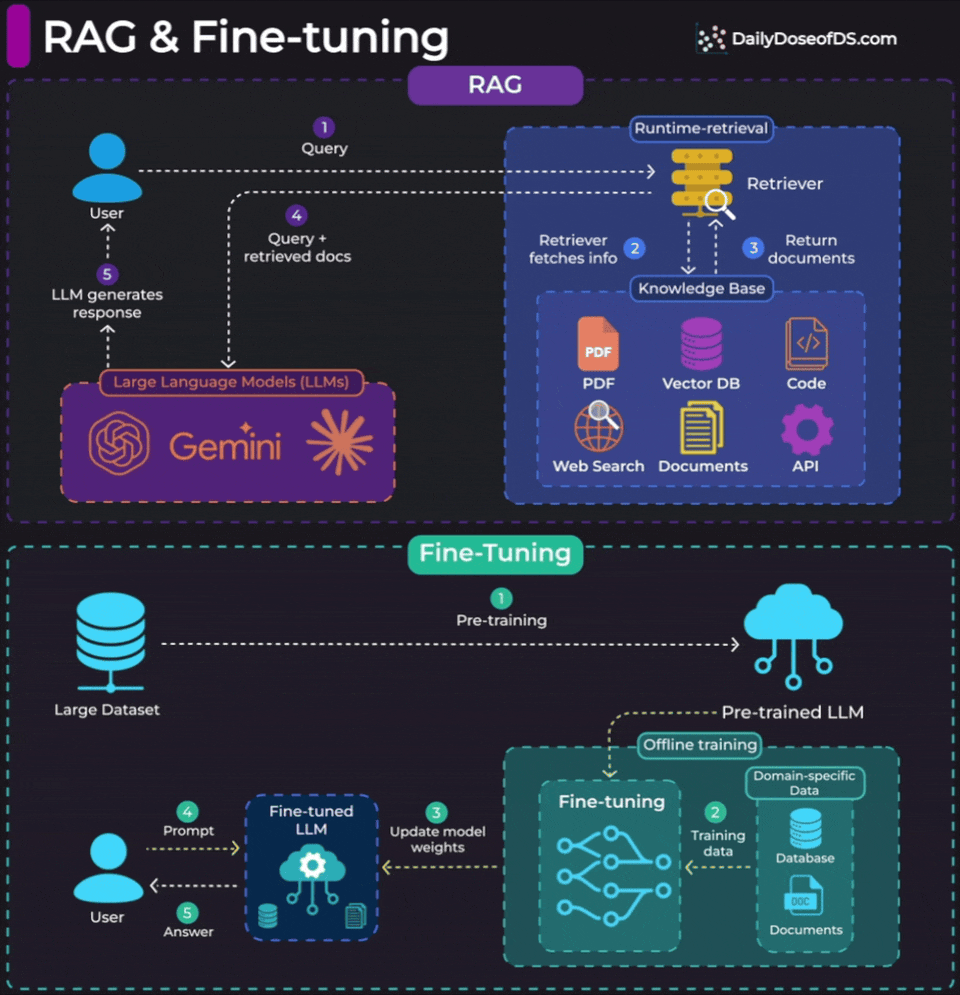 That said, in production systems, you might often need both. A customer support bot might need to pull answers from documentation (RAG) while responding in your brand’s voice (fine-tuning).