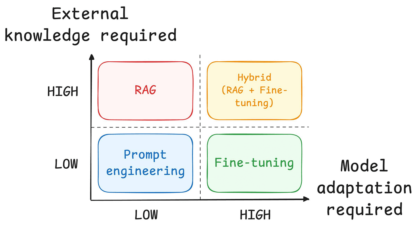 If you need the model to reference specific documents, product catalogs, or anything that updates frequently, that’s mostly a RAG territory.