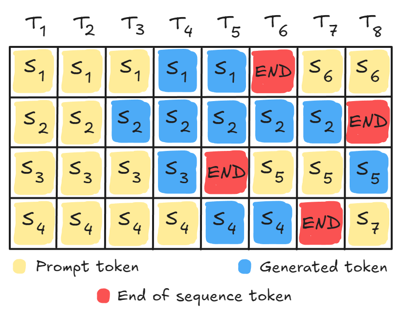 Instead of waiting for the entire batch to finish, the system monitors all sequences and swaps completed ones (<EOS> token) with new queries: