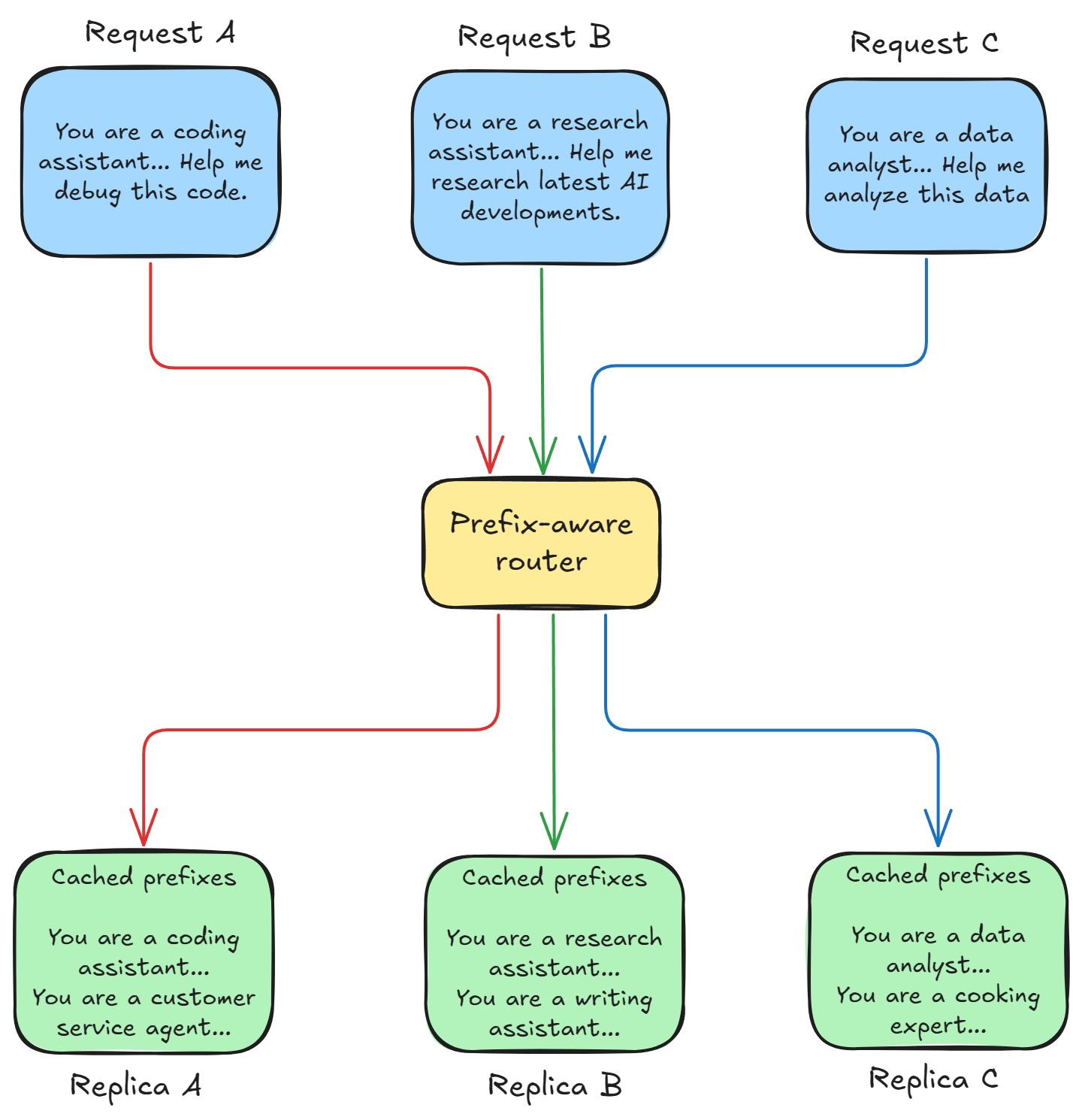 If a new query comes in with a shared prefix that has already been cached on Replica A, but the router sends it to Replica B (which is less busy), Replica B has to recompute the entire prefix’s KV cache.