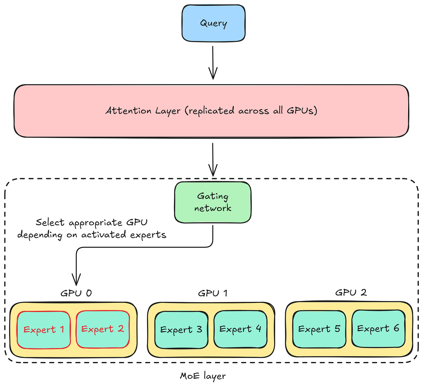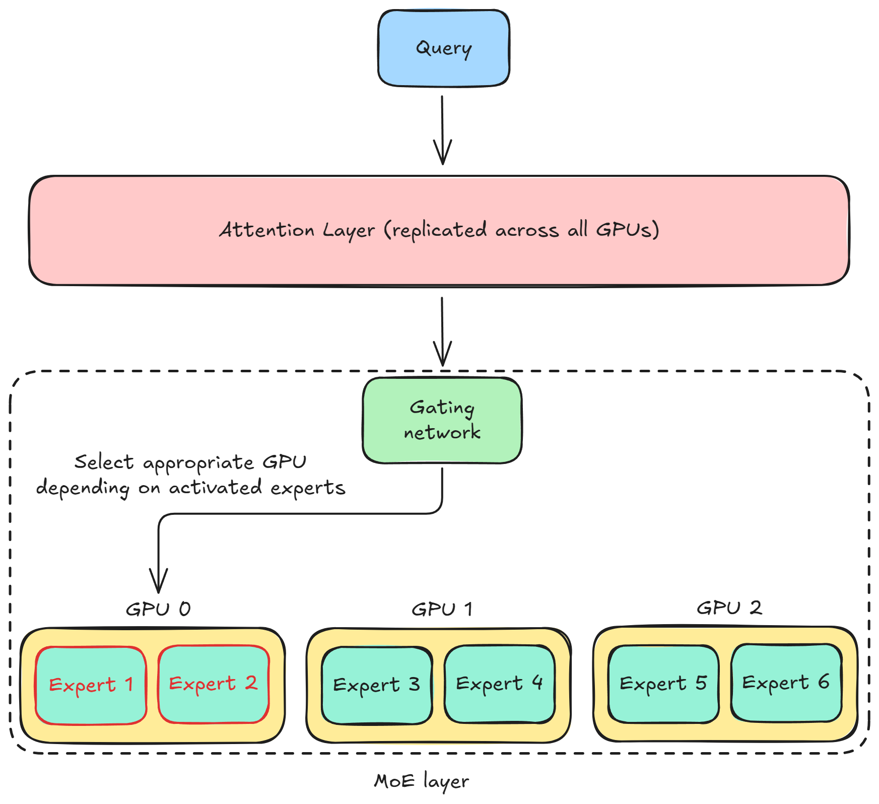 Now, when a query arrives, the gating network in the MoE layer dynamically decides which GPU it should go to, depending on which experts are activated.