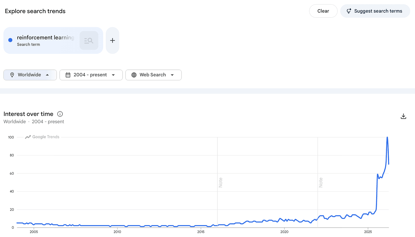 Search interest for “reinforcement learning” was nearly flat from 2004 to 2024. In the past year, it has gone vertical, hitting an all-time high.