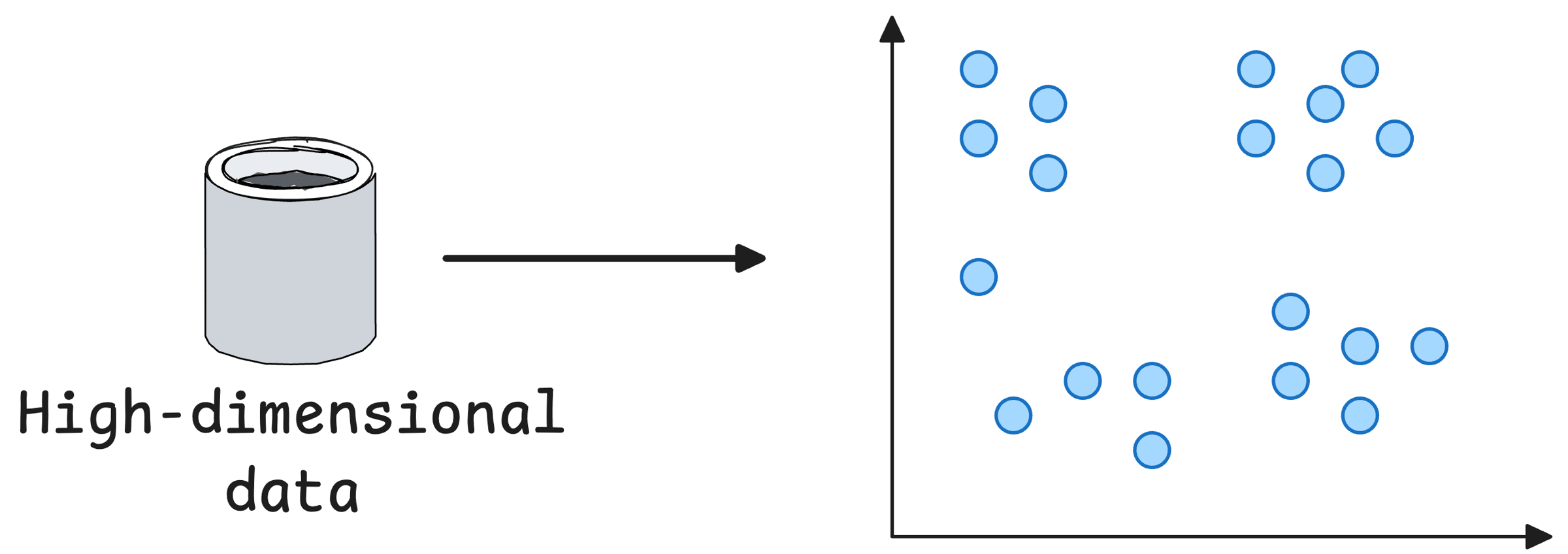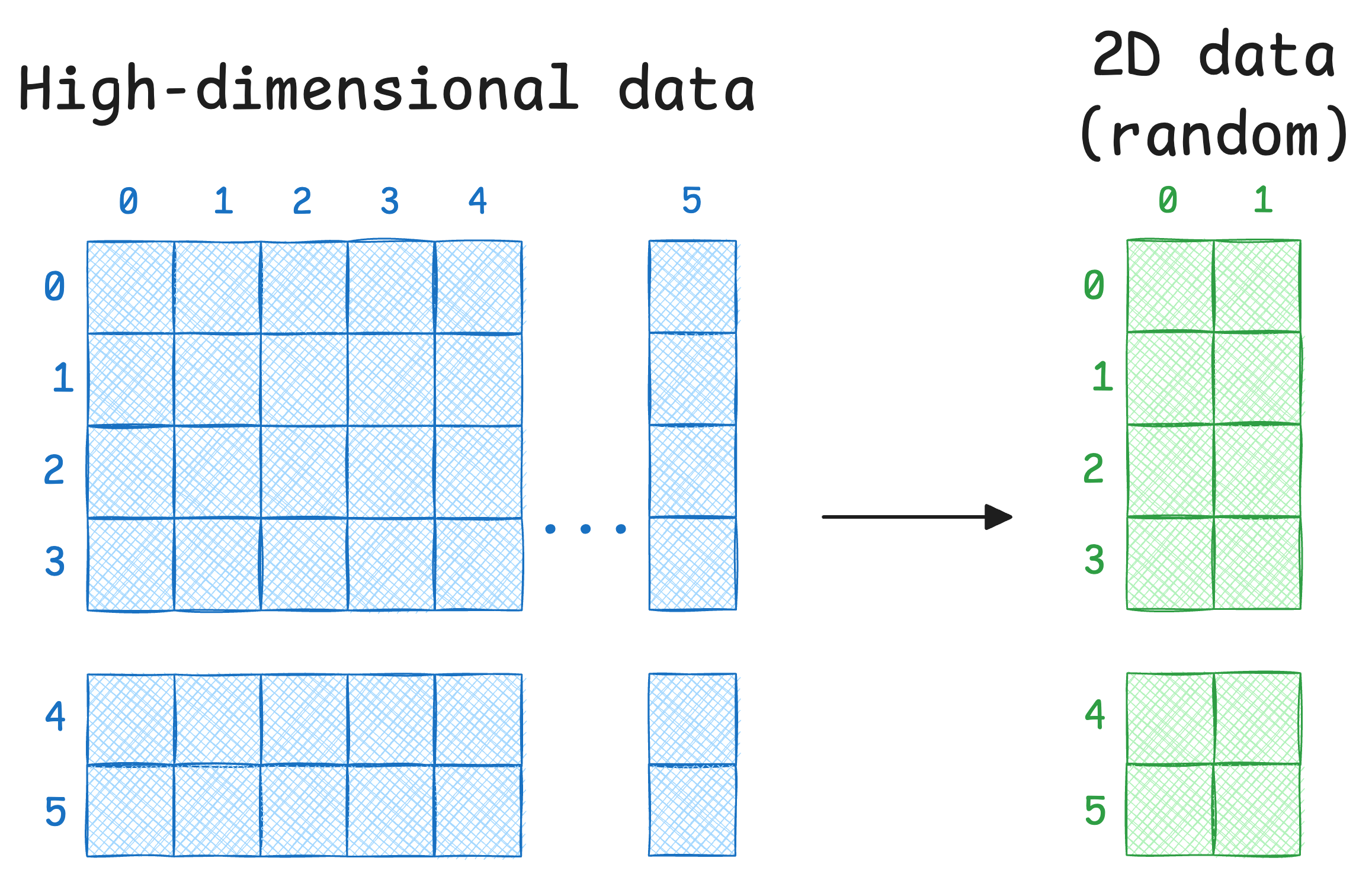 Think of it like this: Imagine 100 people standing in a large hall (high-dimensional space). Now ask them to stand on a narrow sidewalk (2D space). Suddenly, everyone is cramped together.