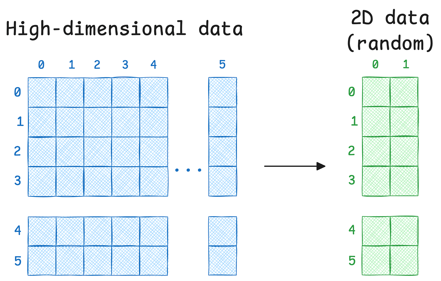 Step 2) Next, for every data point xᵢ in the given data (which is in high-dimensions), randomly initialize its counterpart yᵢ in 2D space. These will be our projections.