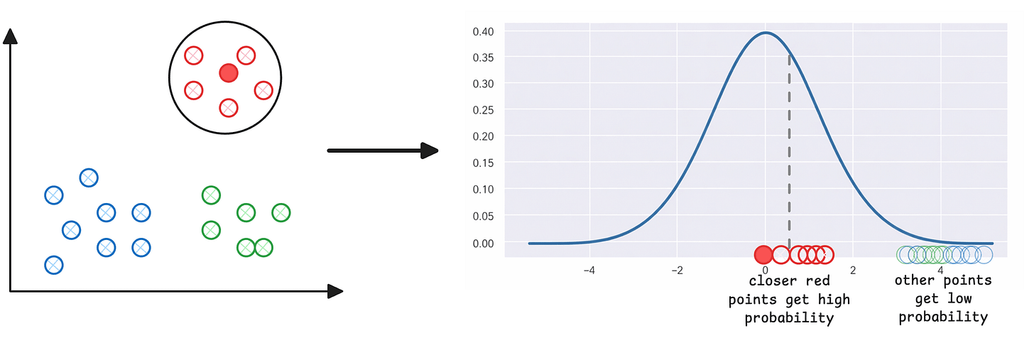 Step 1) For every point (i) in the given high-dimensional data, plot Euclidean distances to all other points (j), which gives you a Gaussian-like probability distribution. For instance, consider the dark red point marked on the left below. Other red points that are closer to it have a higher probability of being i‘s neighbor than those that are far: