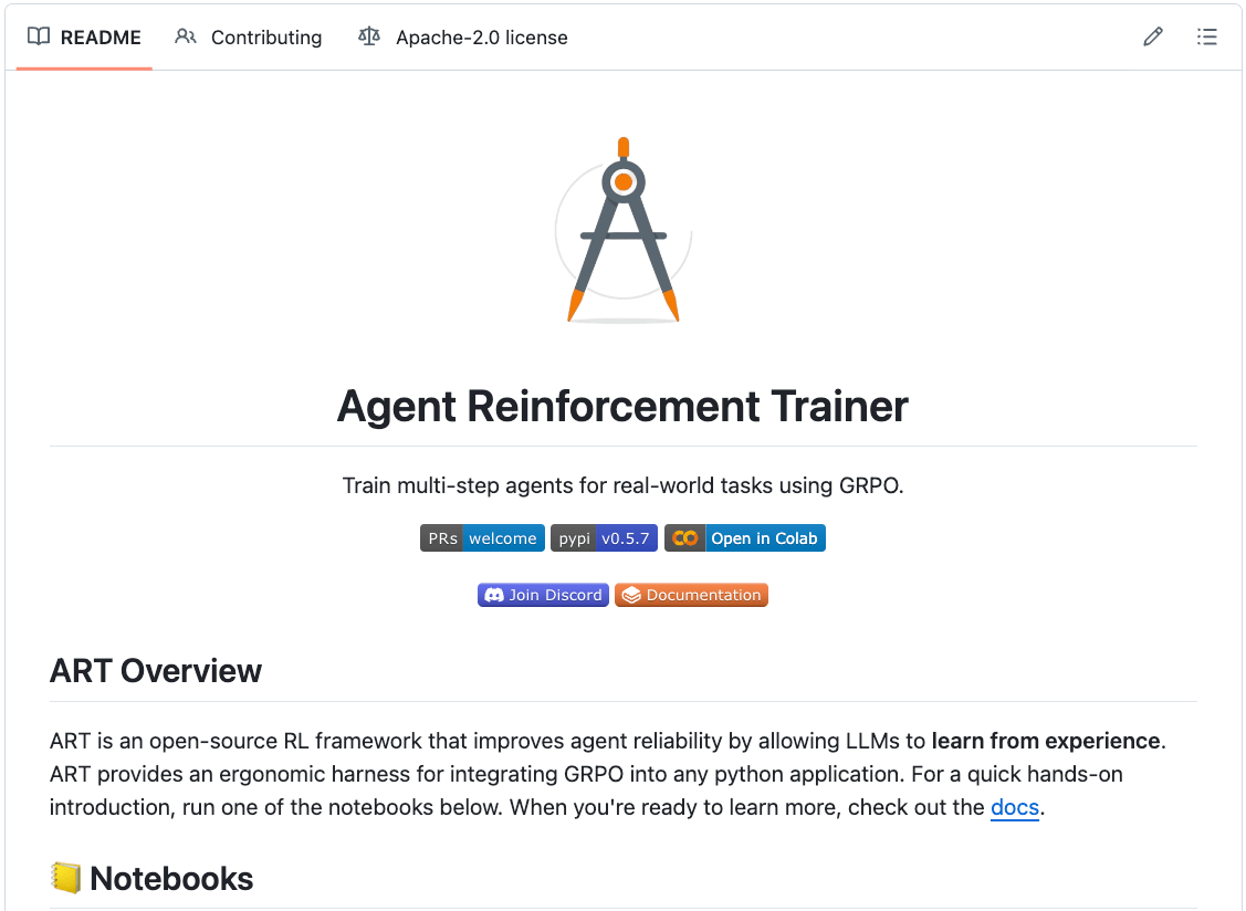 Agent Reinforcement Trainer (ART) is an open-source framework to train multi-step LLM agents for real-world tasks using GRPO.