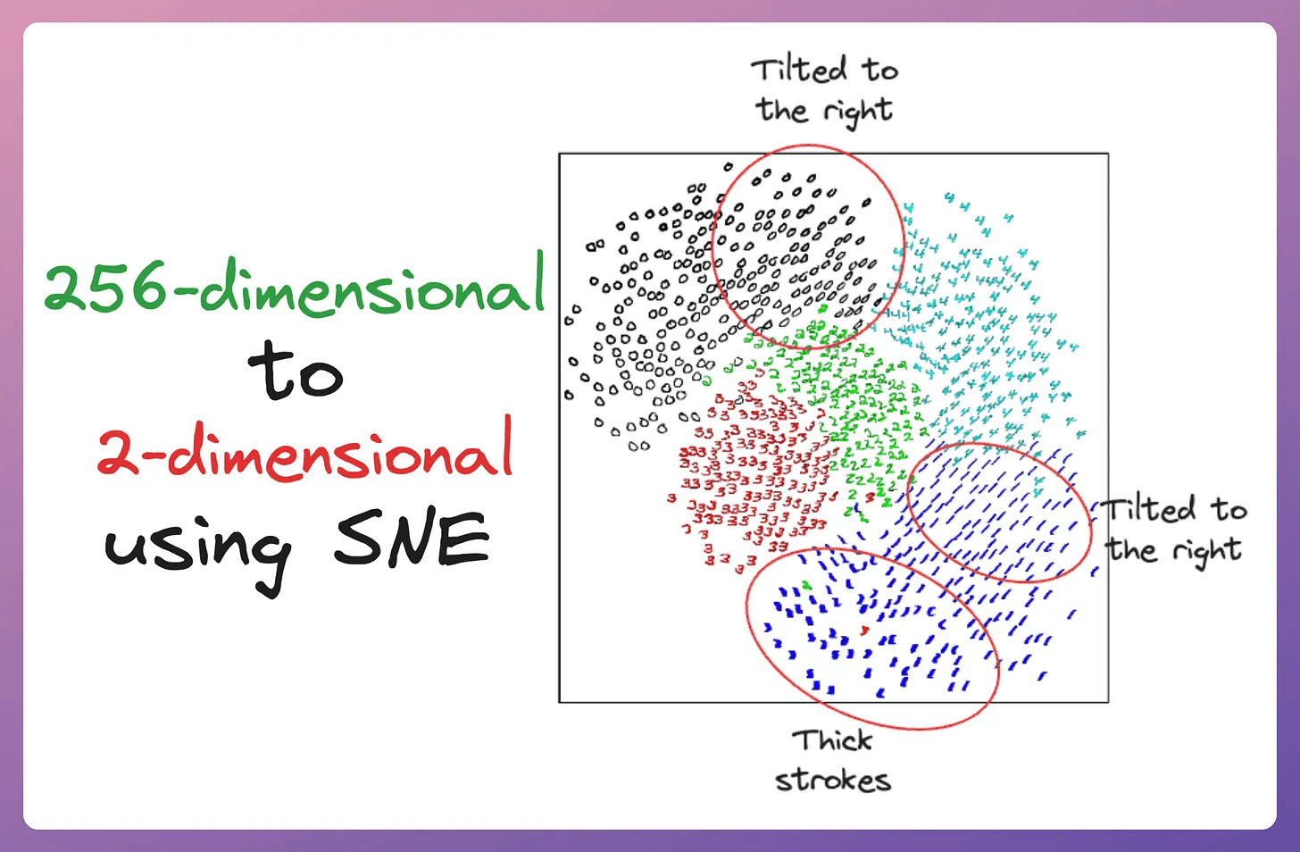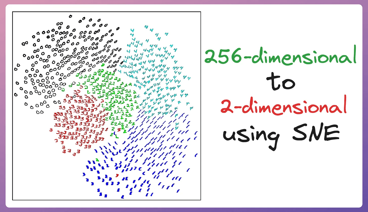 The image below depicts a 2D visualization produced by the SNE algorithm on 256-dimensional handwritten digits:
