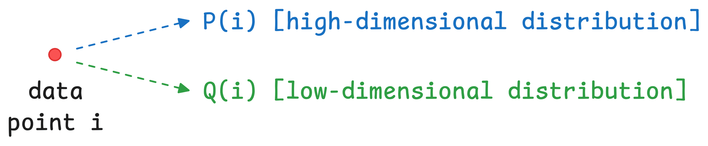 Step 4) At this point, every data point (i) has a high-dimensional distribution and a random low-dimensional distribution. The objective is to match these two distributions so that the low-dimensional representation preserves the neighborhood structure of the high-dimensional data.