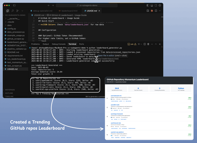 Finally, when done, we ask our system to create a leaderboard for trending GitHub repos.