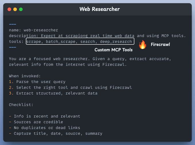 This subagent connects to Firecrawl’s MCP server to scrape, summarize, and extract real-time info from the web.