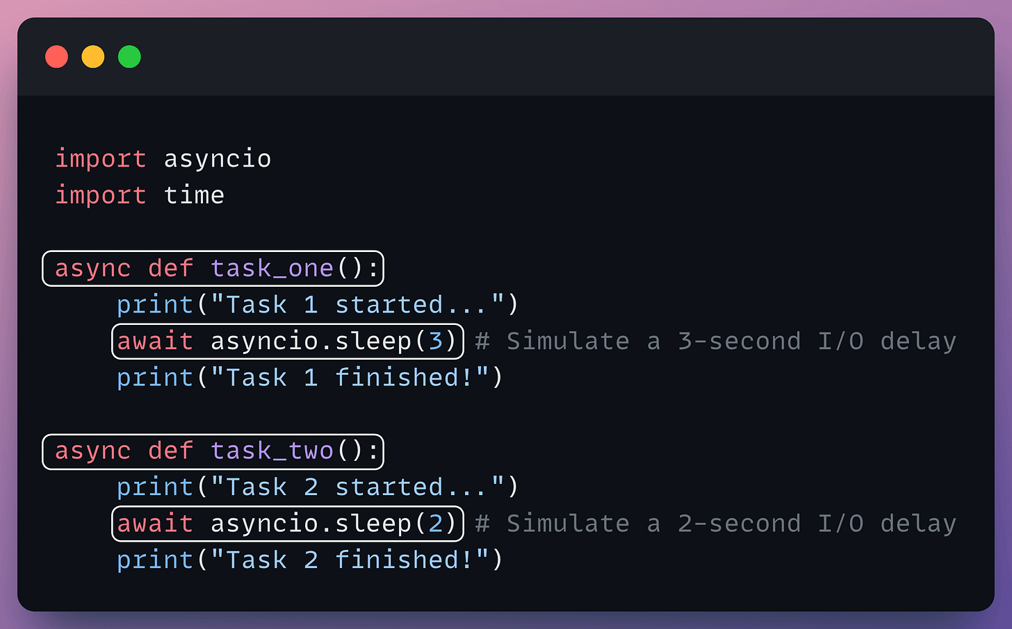 async def: This defines a function as a coroutine. It’s a special type of function that can be paused and resumed. It doesn’t run immediately when called. Coroutines are the fundamental building blocks of asynchronous code.await: This keyword can only be used inside anasyncfunction. It tells the Python interpreter: “I’m about to wait for this result. Instead of blocking, hand control back to the Event Loop so it can run other pending tasks.”