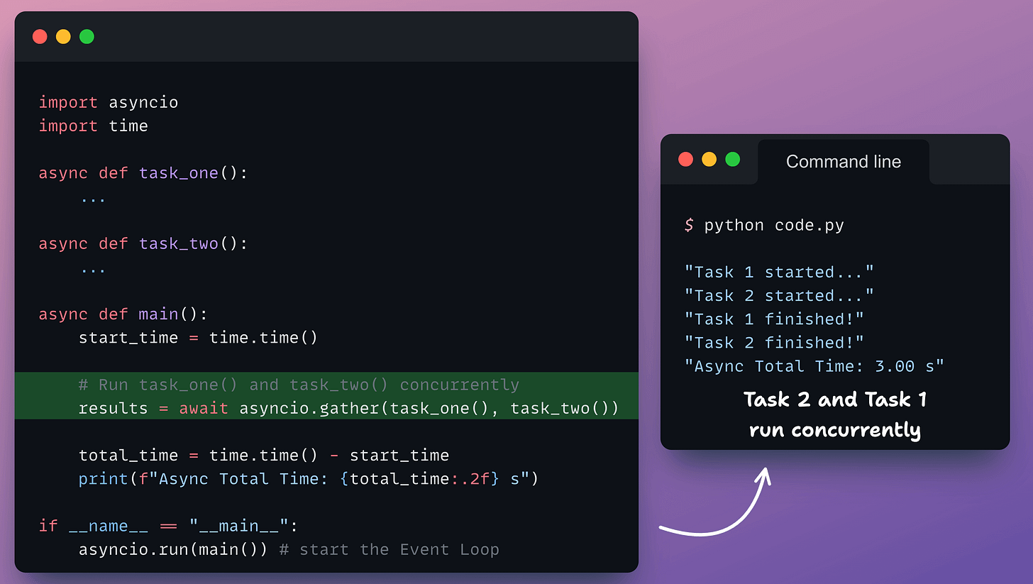 To actually run coroutines concurrently, we must schedule them on the Event Loop using asyncio.gather(), as demonstrated below:
