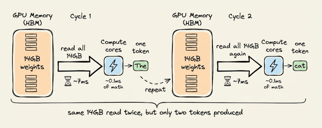 Each token requires loading the full model weights through GPU memory, performing a tiny computation, and then loading all the weights again for the next token. On an A100, this means roughly 1 FLOP per byte of data moved, while the GPU is designed for 100+ FLOPs per byte.