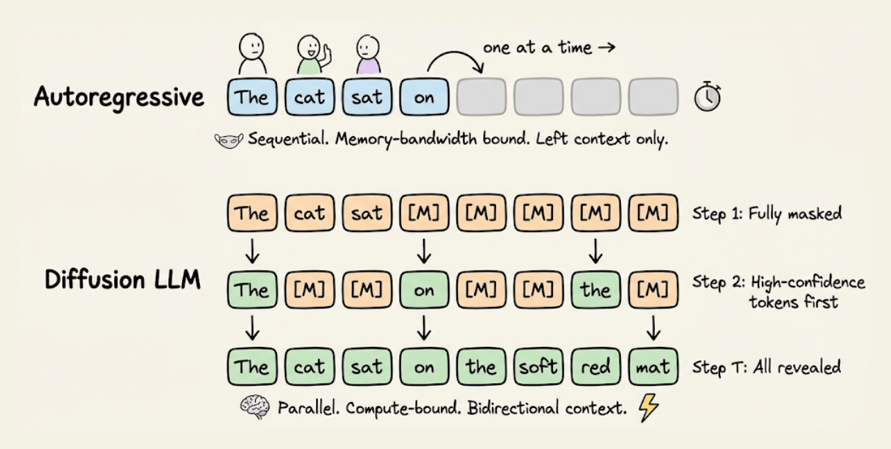 Diffusion LLMs take a completely different approach. They start with a fully masked sequence and iteratively unmask all tokens in parallel, using bidirectional attention at every step. This shifts inference from memory-bandwidth bound to compute-bound, which is exactly where modern GPUs are efficient.