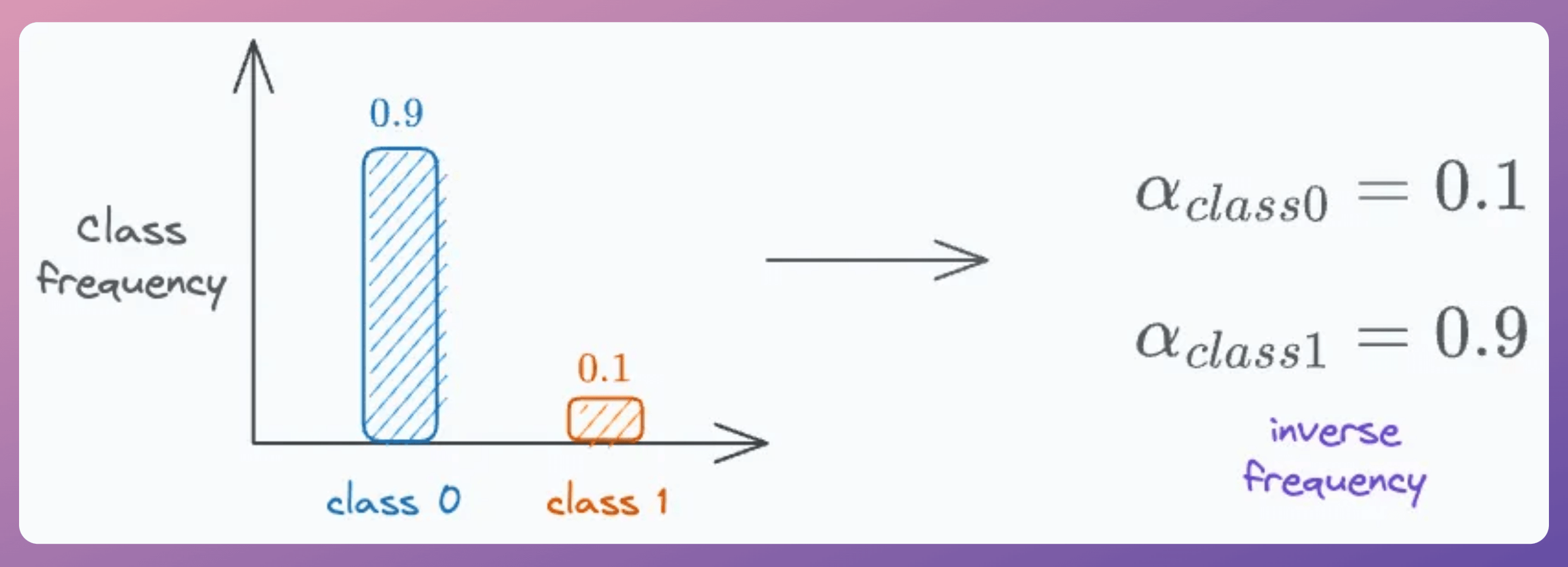 To address this, it adds another weighing parameter (α), which is the inverse of the class frequency, as depicted below: